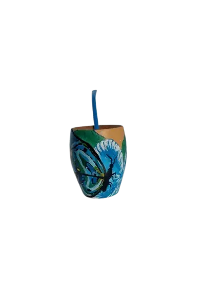 Mate de madera Calden intervenido con pintura acrílico y barniz al agua. Incluye bombilla.